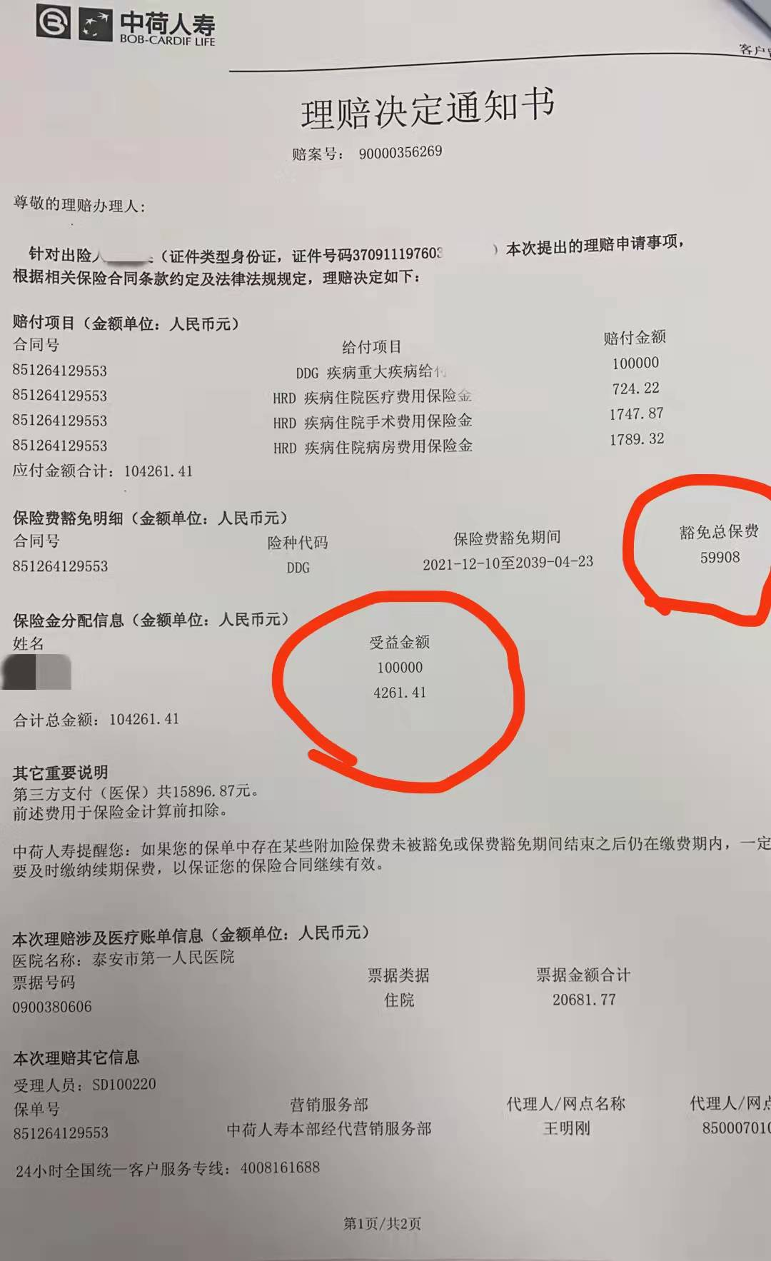 天有不測(cè)風(fēng)云,在2021年郭女士被確診為甲狀腺惡性腫瘤,住院治療共花費(fèi)20681.77元。出院后泰安分公司王明剛總幫助客戶整理遞交了理賠資料,中荷人壽收到資料后于2022年1月12日錄進(jìn)系統(tǒng),次日依照合同約定賠付了104261.41元,并豁免了后期17年的重疾保費(fèi)共計(jì)59908元,重疾保障繼續(xù)有效。